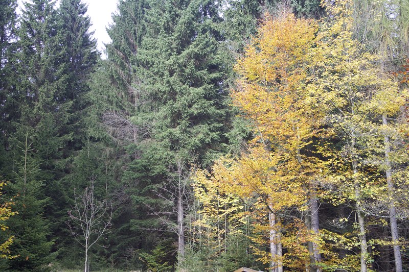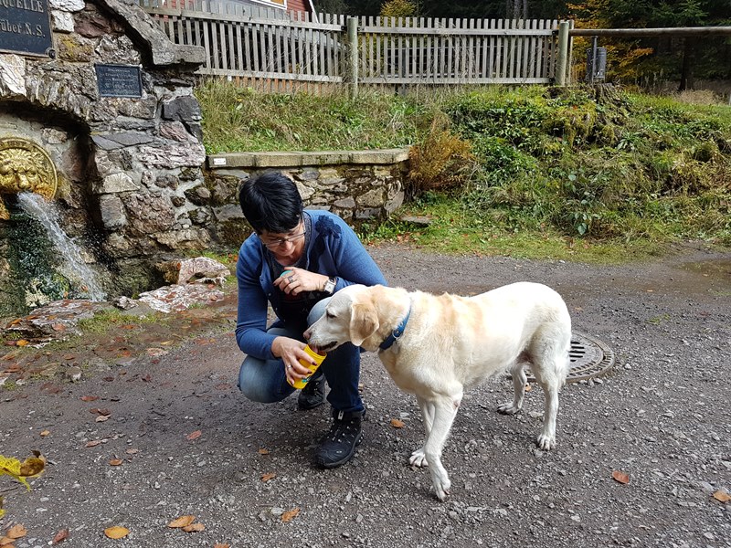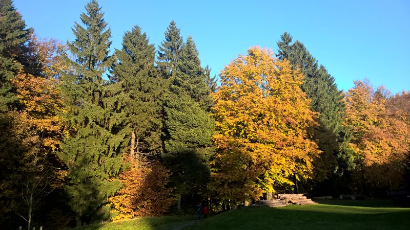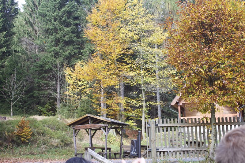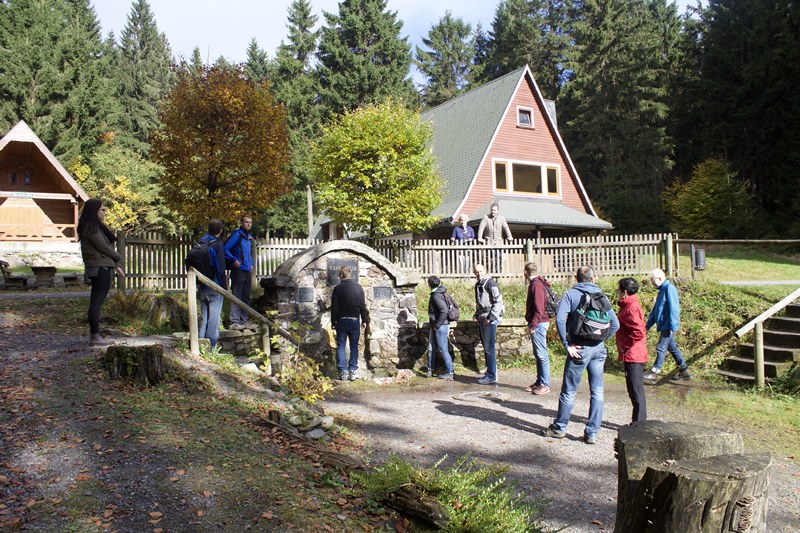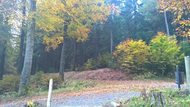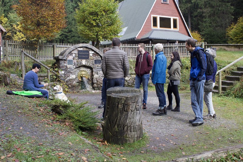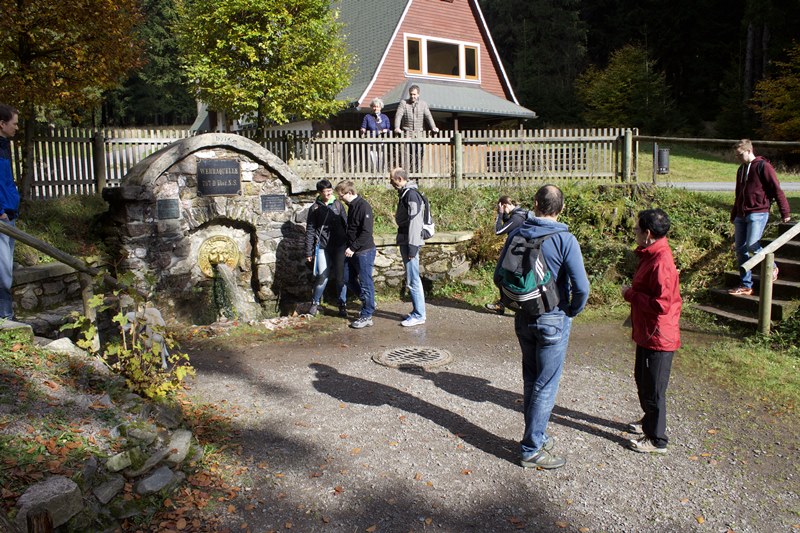 Nach diesem informativen Besuch fuhren wir direkt nach Masserberg zum Wandern. Unser Ziel war die Werraquelle, die wir über einen Rundwanderweg erreichen wollten. Auf dem Parkplatz in Masserberg merkte Silke plötzlich, dass sie ihre Jacke im Gewürzmuseum vergessen hatte. Nur gut, dass Thomas Reserven im Auto hatte und Silke nicht frieren musste. Das Wetter war uns hold. Blauer Himmel und der Herbst zeigte sich in seinen schönsten Farben. Die Werraquelle entspringt hier in rund 800m NN südlich des Eselsbergs. Seit Jahrzehnten streitet man über die eigentliche Quelle der Werra. Nicht weit vom Bleßberg bei Siegmundsburg, an der Nahtstelle vom Thüringer Wald zum Thüringer Schiefergebirge, entspringt der zweite Arm der Werra. Einheimische sprechen von der "echten" und der "falschen" Werraquelle. Auch heute noch wird so manche Wortschlacht zwischen Fehrenbachern und Siegmundsburgern geführt. Mehrere Untersuchungen und Gutachten wurden auf Grund der Streitigkeiten in Auftrag gegeben. Diese konnten jedoch keine eindeutige Klärung herbeiführen.