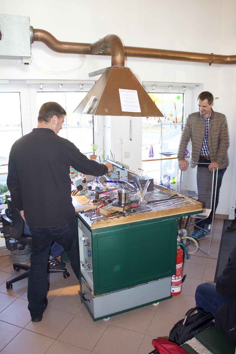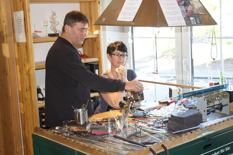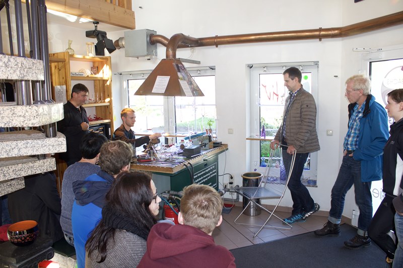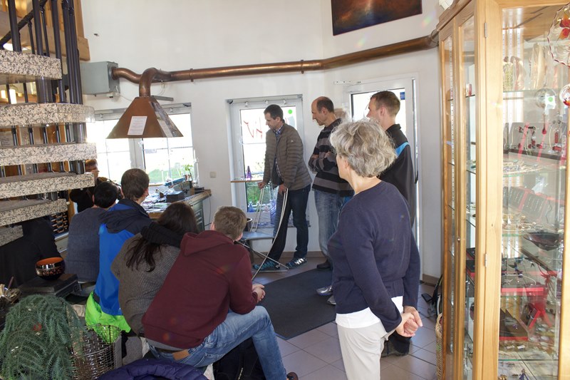 sowie Informationen zur Geschichte und Gegenwart der Glaskunst. Die Geschichte des Thüringer Glases begann im 14. Jahrhundert, als im Thüringer Wald eine Vielzahl von Glashütten gegründet wurde. Die Stäbe und Röhren dienten als Ausgangsmaterial für die Glasbläser, die sie – zumeist in Heimarbeit – mittels einer Öllampe erhitzten und zu Glasperlen, Figürchen und anderen Artikeln umformten. Interessant war auch zu erfahren, dass Glasbläser und Glasmacher zwei unterschiedliche Berufe sind. Er erklärte uns die heutige Technik und Verarbeitung der verschiedenen Materialien, wie z. B. das hochwertige Lauschaer Glas und Glas der Firma Schott. Nach der Theorie kam die Praxis. Die blau-violette Flamme zuckte kurz, als Herr Sachs die bleistiftdicke Glasstange hinein hielt. Vorsichtig drehte er den Stab. Nach einer Minute konnte er das eben noch harte Glas wie Karamell in die Länge ziehen und nach seinen Wünschen formen. Der Kreativität sind hier keine Grenzen gesetzt.