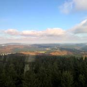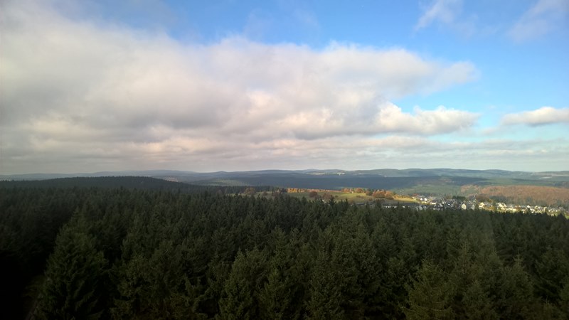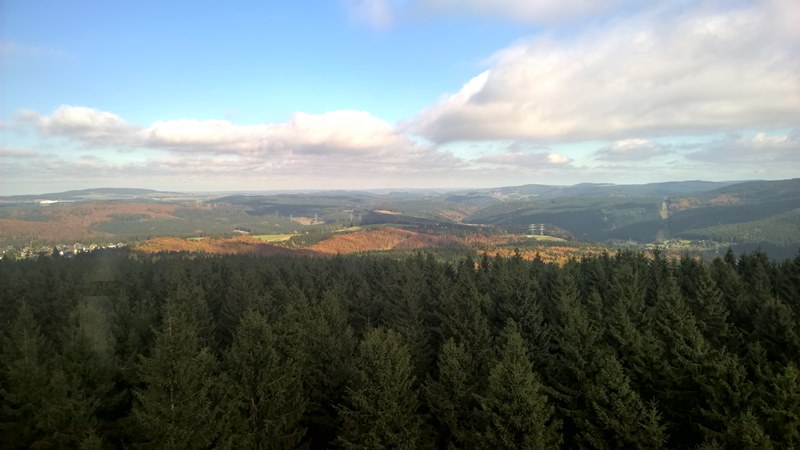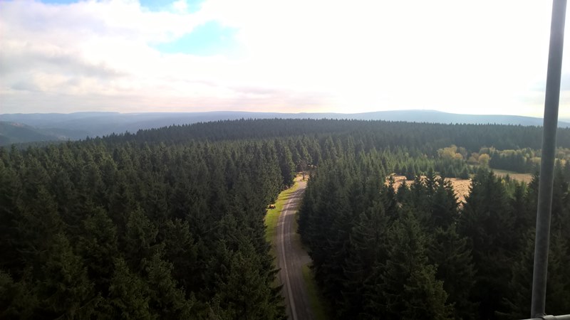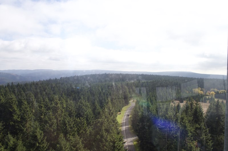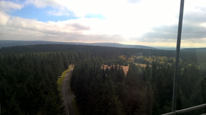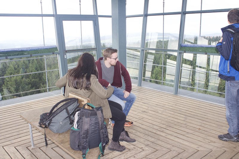 Kurz vor Ende des Rundweges erreichten wir die bekannte Rennsteig-Turmbaude in einer Höhe von 830 Metern. Einige stiegen die Treppen hinauf, um den wunderschönen Blick über den Thüringer Wald zu genießen und Fotos zu machen.