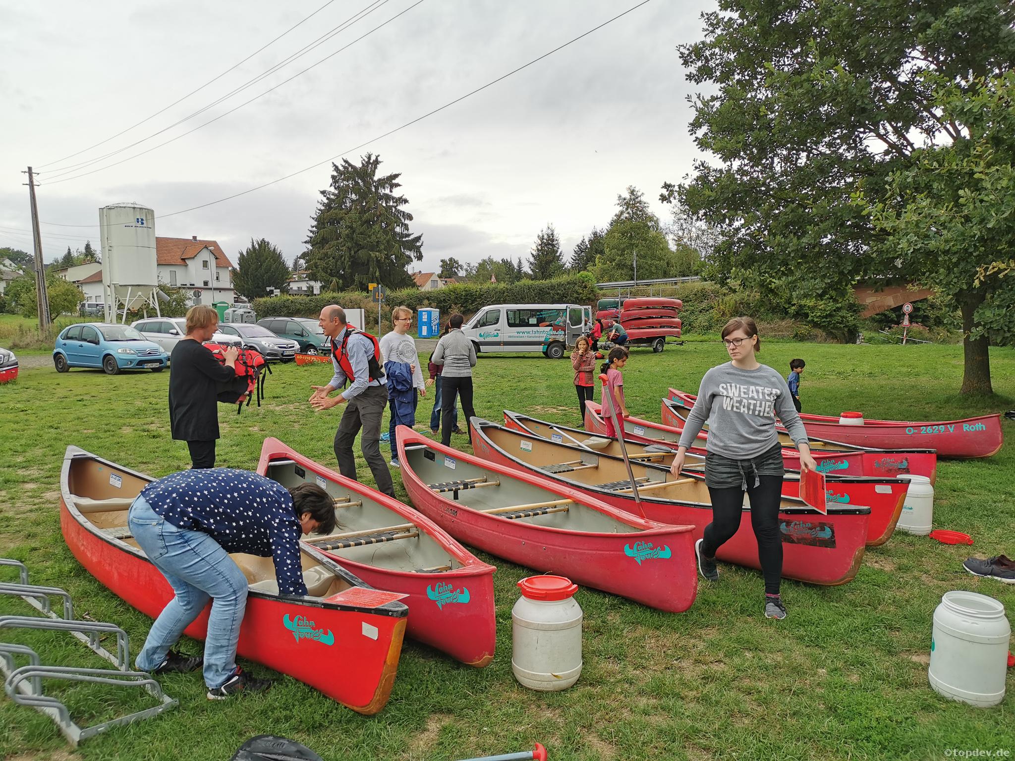 Weil Sport schließlich auch hungrig macht, nahmen wir gegen 13 Uhr im Nahe gelegenen Restaurant Dammühle unser Mittagessen ein. Nun waren die Akkus wieder aufgeladen und die nächste sportliche Herausforderung wartete auf uns. Der Bus brachte uns nach Roth, wo wir eine 3- stündige Kanu-Tour auf der Lahn vor uns hatten. Wir erhielten auch hier eine ausführliche Einweisung, wasserdichte Behälter für die Wertsachen (die sich später als wahrer Segen erwiesen), Schwimmwesten und Paddel. Nur die Angabe, dass regelmäßig 30 Prozent der Gäste ein Lahn-Bad nehmen werden, irritierte uns. Nachdem wir uns auf die Kanus verteilt hatten, ließen wir nun Boot für Boot ins Wasser. Jetzt waren Armkraft und Geschicklichkeit gefragt. Auf Grund des Niedrigwassers war es stellenweise so flach, dass die Kanus mit der Hand von den Kiesbänken gezogen werden mussten. Große Äste, die in das Wasser ragten, und Strömungen waren zu beachten. Dort erwischte uns doch die 30-Prozent-Klausel. Silke, Thomas und Ahmet haben „ein Bad in der Menge genommen“. Ihr Kanu trieb auf Grund der Strömung an den Uferrand, drehte sich in die Breite und kippte so einfach um. Alle drei nass bis auf die Haut und noch einige Wasser-Kilometer vor sich. Glücklicherweise ist ihnen weiter nichts passiert und auch die wasserdicht verstauten Wertsachen waren noch brauchbar. Ganz zum Schluss hatten wir noch einen „Lahnbader“: Yamilkas Freud Jose Ignacio fiel ins Wasser, als er sein Kanu am Ende der Tour fest machen wollte. Was für ein Pech!