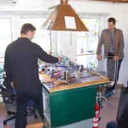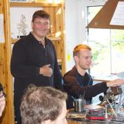 Nun konnten wir selbst tätig werden und uns in der Glasbläserei einmal versuchen. Unter den Freiwilligen waren nur Silke und Max, die sich gar nicht so schlecht anstellten. Das Ergebnis ihrer künstlerischen Aktion ist im Büro zu bestaunen.