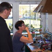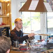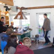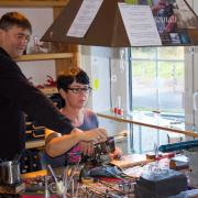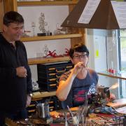 sowie Informationen zur Geschichte und Gegenwart der Glaskunst. Die Geschichte des Thüringer Glases begann im 14. Jahrhundert, als im Thüringer Wald eine Vielzahl von Glashütten gegründet wurde. Die Stäbe und Röhren dienten als Ausgangsmaterial für die Glasbläser, die sie – zumeist in Heimarbeit – mittels einer Öllampe erhitzten und zu Glasperlen, Figürchen und anderen Artikeln umformten. Interessant war auch zu erfahren, dass Glasbläser und Glasmacher zwei unterschiedliche Berufe sind. Er erklärte uns die heutige Technik und Verarbeitung der verschiedenen Materialien, wie z. B. das hochwertige Lauschaer Glas und Glas der Firma Schott. Nach der Theorie kam die Praxis. Die blau-violette Flamme zuckte kurz, als Herr Sachs die bleistiftdicke Glasstange hinein hielt. Vorsichtig drehte er den Stab. Nach einer Minute konnte er das eben noch harte Glas wie Karamell in die Länge ziehen und nach seinen Wünschen formen. Der Kreativität sind hier keine Grenzen gesetzt.