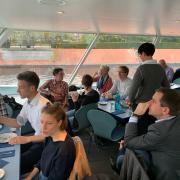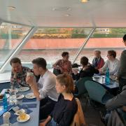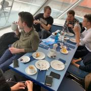 Sobald jeder im Schiff ein gemütliches Plätzchen im vorderen Bereich des Schiffes gefunden hatte, ging die Tour los. Kurz darauf nahm eine Kellnerin unsere Bestellungen auf. Zusätzlich hatte Susanne eine nachträgliche Geburtstagskuchenrunde für uns alle ausgegeben: Einen Käsekuchen und eine Schwarzwälder Kirschtorte, bei denen wir ordentlich zuschlagen konnten. Ein herzliches Dankeschön an Susanne!