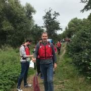 Weil Sport schließlich auch hungrig macht, nahmen wir gegen 13 Uhr im Nahe gelegenen Restaurant Dammühle unser Mittagessen ein. Nun waren die Akkus wieder aufgeladen und die nächste sportliche Herausforderung wartete auf uns. Der Bus brachte uns nach Roth, wo wir eine 3- stündige Kanu-Tour auf der Lahn vor uns hatten. Wir erhielten auch hier eine ausführliche Einweisung, wasserdichte Behälter für die Wertsachen (die sich später als wahrer Segen erwiesen), Schwimmwesten und Paddel. Nur die Angabe, dass regelmäßig 30 Prozent der Gäste ein Lahn-Bad nehmen werden, irritierte uns. Nachdem wir uns auf die Kanus verteilt hatten, ließen wir nun Boot für Boot ins Wasser. Jetzt waren Armkraft und Geschicklichkeit gefragt. Auf Grund des Niedrigwassers war es stellenweise so flach, dass die Kanus mit der Hand von den Kiesbänken gezogen werden mussten. Große Äste, die in das Wasser ragten, und Strömungen waren zu beachten. Dort erwischte uns doch die 30-Prozent-Klausel. Silke, Thomas und Ahmet haben „ein Bad in der Menge genommen“. Ihr Kanu trieb auf Grund der Strömung an den Uferrand, drehte sich in die Breite und kippte so einfach um. Alle drei nass bis auf die Haut und noch einige Wasser-Kilometer vor sich. Glücklicherweise ist ihnen weiter nichts passiert und auch die wasserdicht verstauten Wertsachen waren noch brauchbar. Ganz zum Schluss hatten wir noch einen „Lahnbader“: Yamilkas Freud Jose Ignacio fiel ins Wasser, als er sein Kanu am Ende der Tour fest machen wollte. Was für ein Pech!